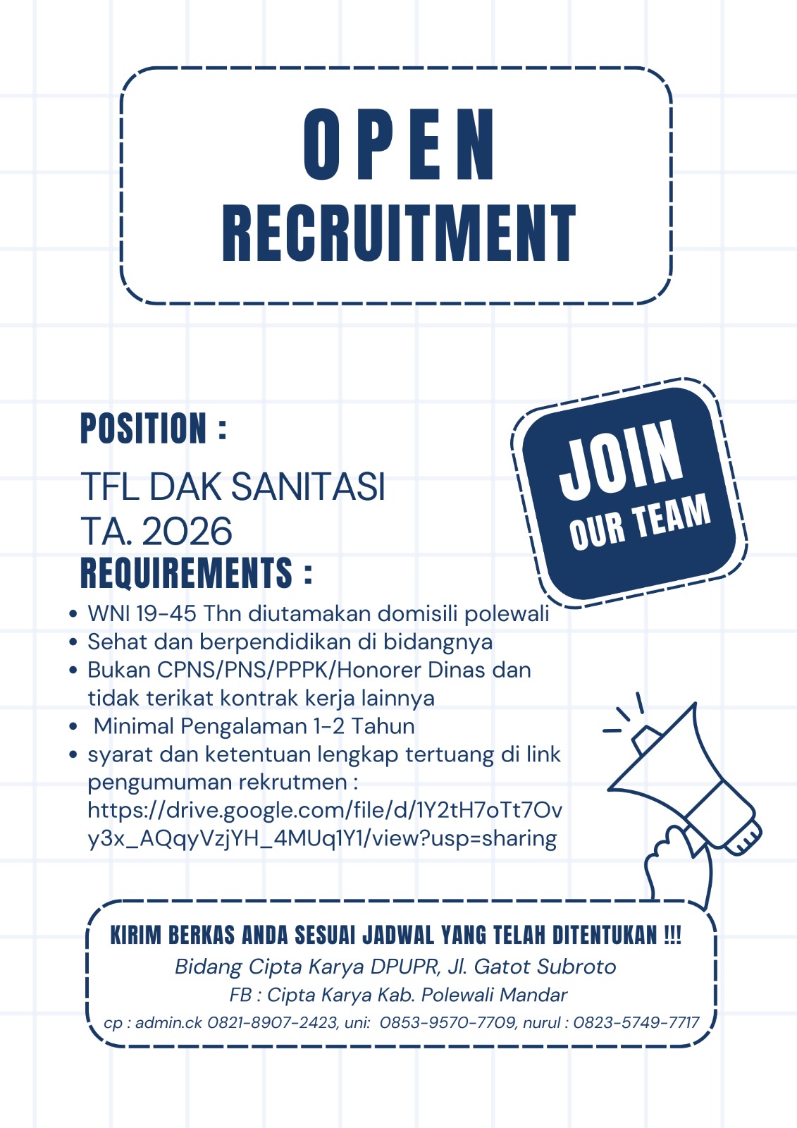 PENGUMUMANPENTING: HASIL SELEKSI TAHAP I (ADMINISTRASI) REKRUTMEN TENAGA FASILITATOR LAPANGAN (TFL) PENUNJANG PROGRAM DAK BIDANG SANITASI KABUPATEN POLEWALI MANDAR TAHUN ANGGARAN 2026Sallang...