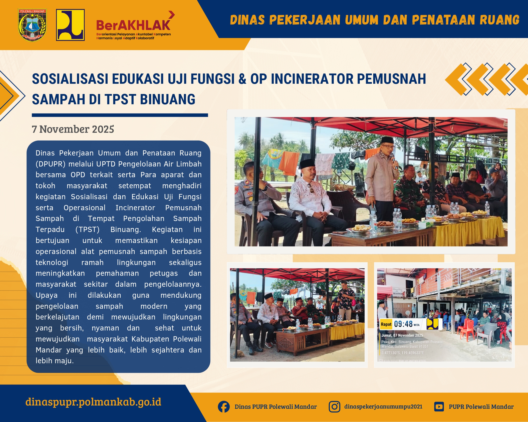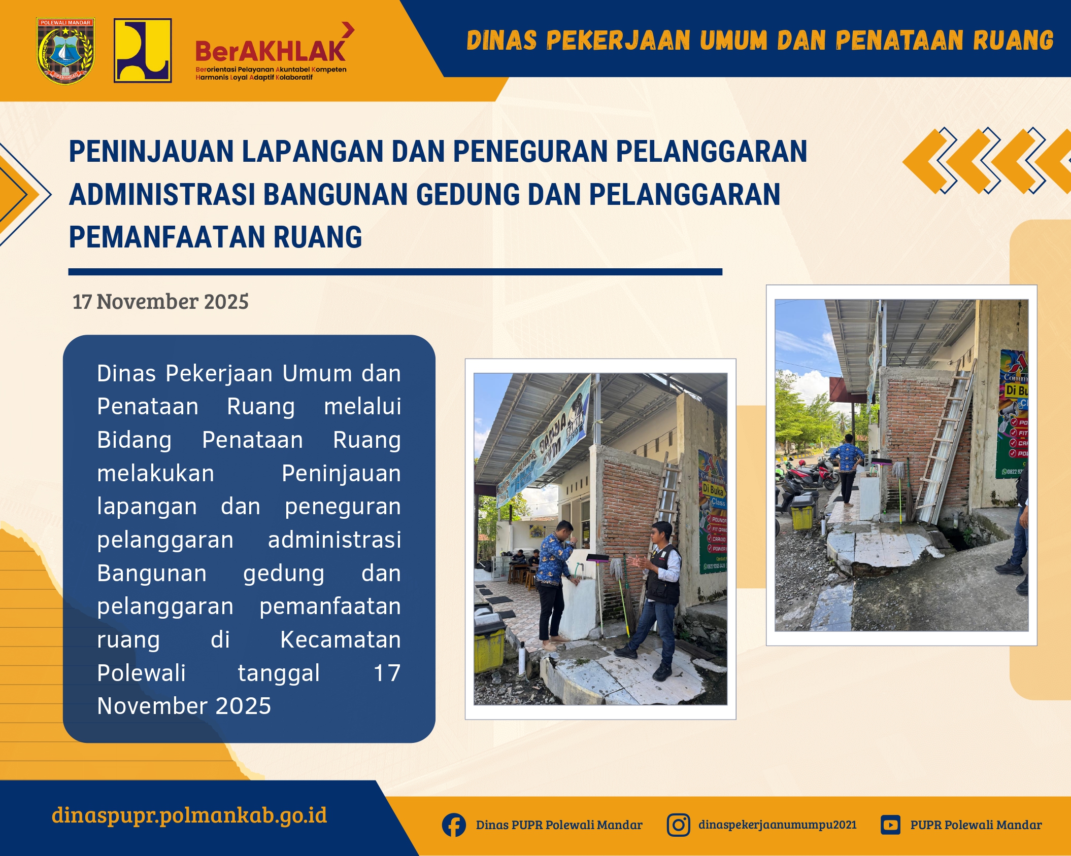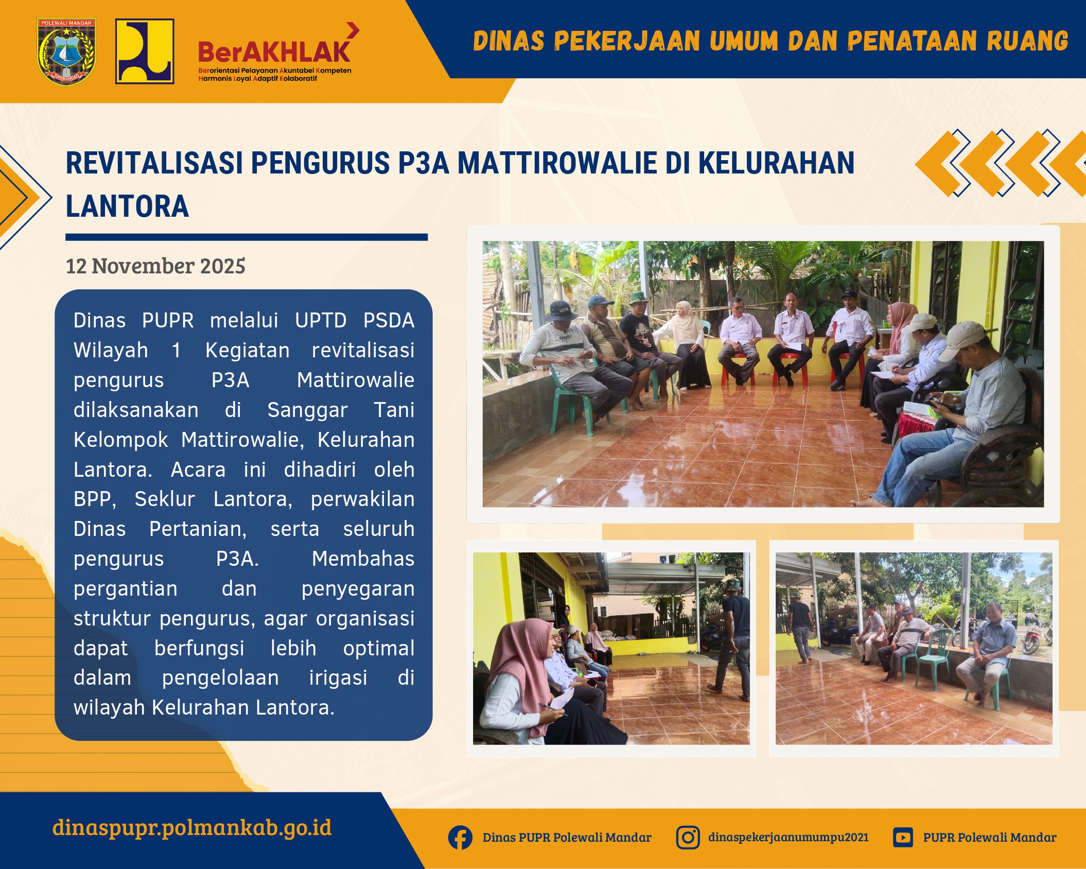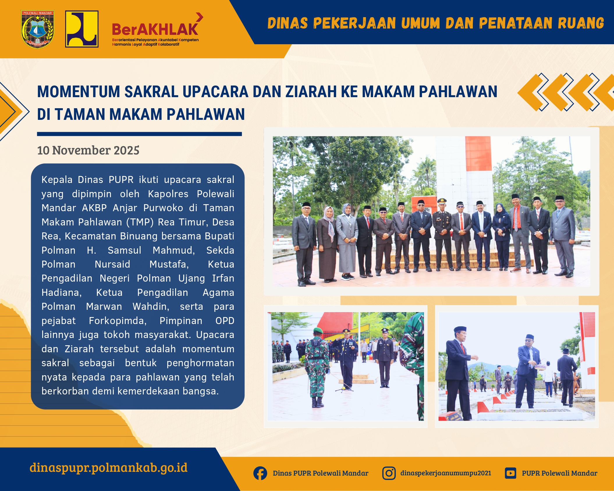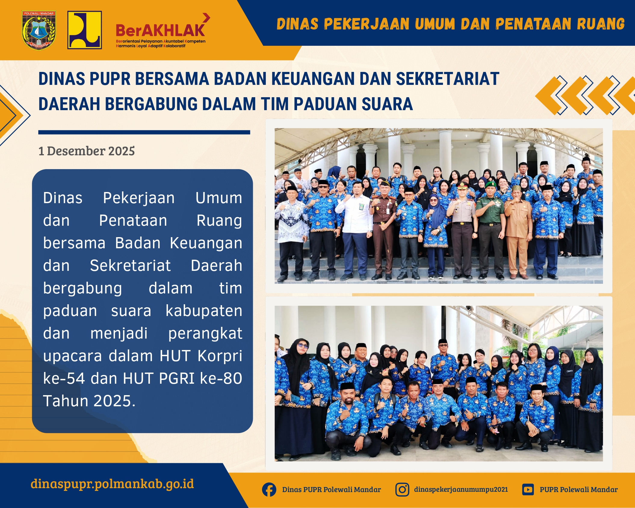 HUT KORPRI ke-54 di Polewali Mandar: Dinas PUPR Pimpin Rangkaian Meriah dengan Semangat KebersamaanDinas PUPR, Perayaan Hari Ulang Tahun Korps Pegawai Republik Indonesia (KORPRI) ke-54 Tahun 2025 di Kabupaten Polewali Mandar berlangsung meriah dan penuh semangat kebersamaan. Tahun ini, Kepala Dinas PUPR Kabupaten Polewali Mandar, Ir. Husain Ismail, ST., M.AP., dipercayakan sebagai Ketua Panitia, memimpin rangkaian kegiatan yang dirancang untuk memperkuat soliditas ASN sekaligus memeriahkan momentum penting bagi seluruh aparatur negara.Perayaan dibuka pada Kamis, 20 November 2025 dengan Kick Off Rangkaian Kegiatan HUT KORPRI, ditandai dengan Pertandingan Eksebisi Tenis Lapangan Forkopimda di Lapangan Tenis Kantor Bupati. Layaknya pukulan pertama dalam sebuah pertandingan besar, kegiatan pembuka ini menjadi tanda dimulainya semangat persatuan yang mengalir di antara seluruh ASN.Pada hari berikutnya, dilanjutkan dengan Senam Sehat yang bertabur hadiah. Acara tersebut dila... Selengkapnya...